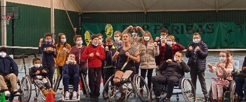 Afin qu’il y ait une continuité dans le projet, nous avons accepté et amené deux classes de 6èmes supporter Pauline ; les élèves ont pu à nouveau profiter d’ateliers de tennis adaptés !
